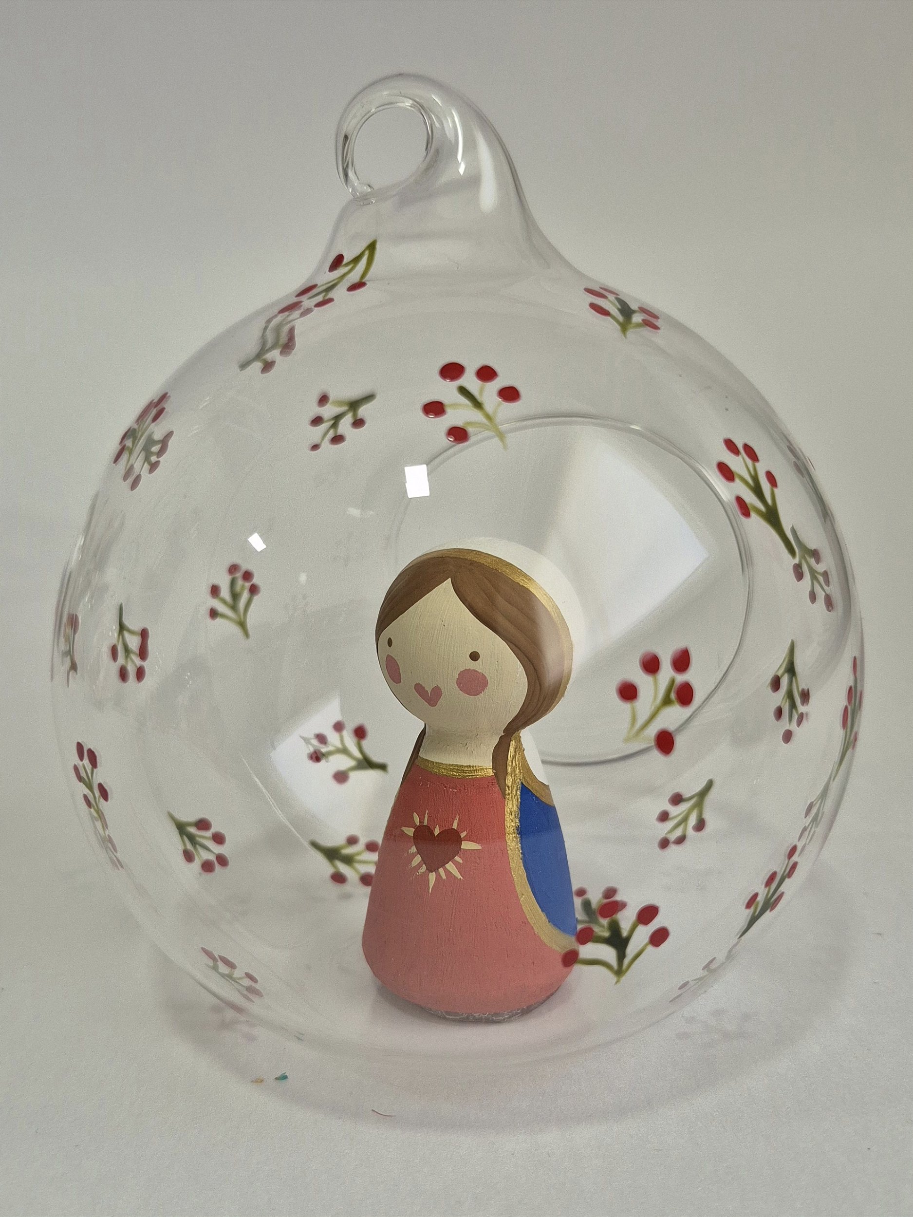 1 Bola de Natal em Vidro pintada a mão + 1 imagem sacra de 6cm em madeira pintados a mão.