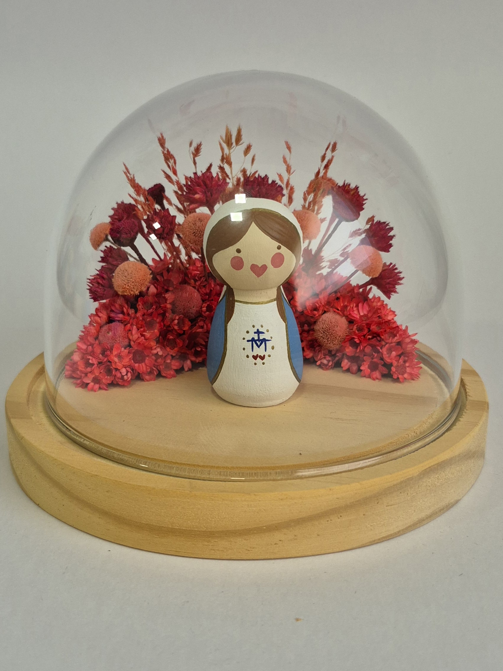 Cúpula P em Madeira Pinus e Vidro + Flores secas + Imagem sacra de 6cm em madeira pintada a mão.